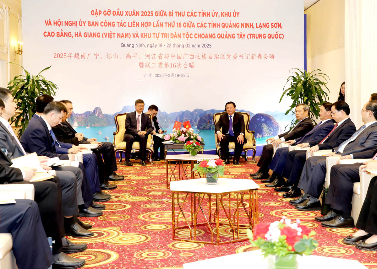 Trong khuôn khổ chương trình Gặp gỡ đầu Xuân năm 2025 giữa Bí thư các Tỉnh ủy và Hội nghị Ủy ban công tác liên hợp (UBCTLH) lần thứ 16 giữa 4 tỉnh (Quảng Ninh, Hà Giang, Lạng Sơn và Cao Bằng) của Việt Nam và Khu tự trị dân tộc Choang Quảng Tây, Trung Quốc, chiều 20.2, tại thành phố Hạ Long, tỉnh Quảng Ninh, đồng chí Nguyễn Xuân Thắng, Ủy viên Bộ Chính trị, Giám đốc Học viện Chính trị Quốc gia Hồ Chí Minh đã có buổi tiếp xã giao đồng chí Trần Cương, Bí thư Khu ủy Khu tự trị dân tộc Choang Quảng Tây, Trung Quốc. Dự buổi tiếp có các đồng chí Bí thư Tỉnh ủy 4 tỉnh: Quảng Ninh, Hà Giang, Lạng Sơn, Cao Bằng và Bí thư Khu ủy Khu tự trị dân tộc Choang Quảng Tây, Trung Quốc.